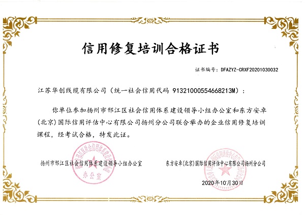 日前,華創(chuàng )公司順利通過(guò)信用修復培訓考核,收到揚州市社會(huì )信用體系建設領(lǐng)導小組辦公室頒發(fā)的江蘇省企業(yè)信用管理貫標證書(shū)。誠信履約是企業(yè)立身之本,華創(chuàng )公司自創(chuàng )立以來(lái),始終注重企業(yè)信用管理體系建設,在政府主管部門(mén)的工作指導下,企業(yè)信用管理工作不斷深化,為企業(yè)進(jìn)一步開(kāi)展市場(chǎng)合作打下了堅實(shí)基礎。